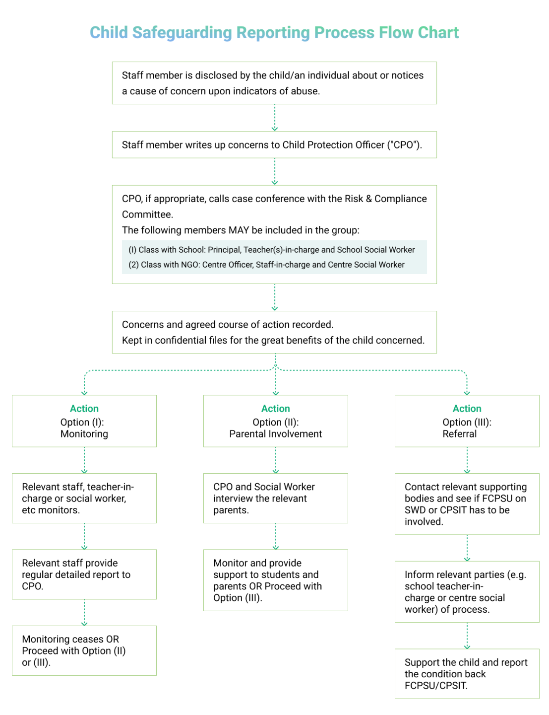 After receiving the reports, our Child Protection Officer will investigate the incident on a confidential basis and will work with the Risk and Compliance Committee to take appropriate action (see image below).