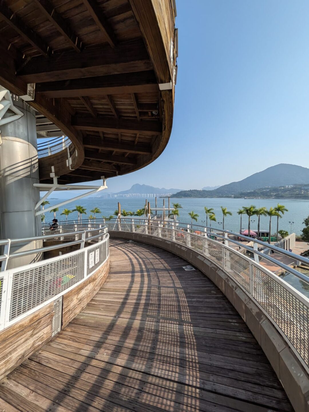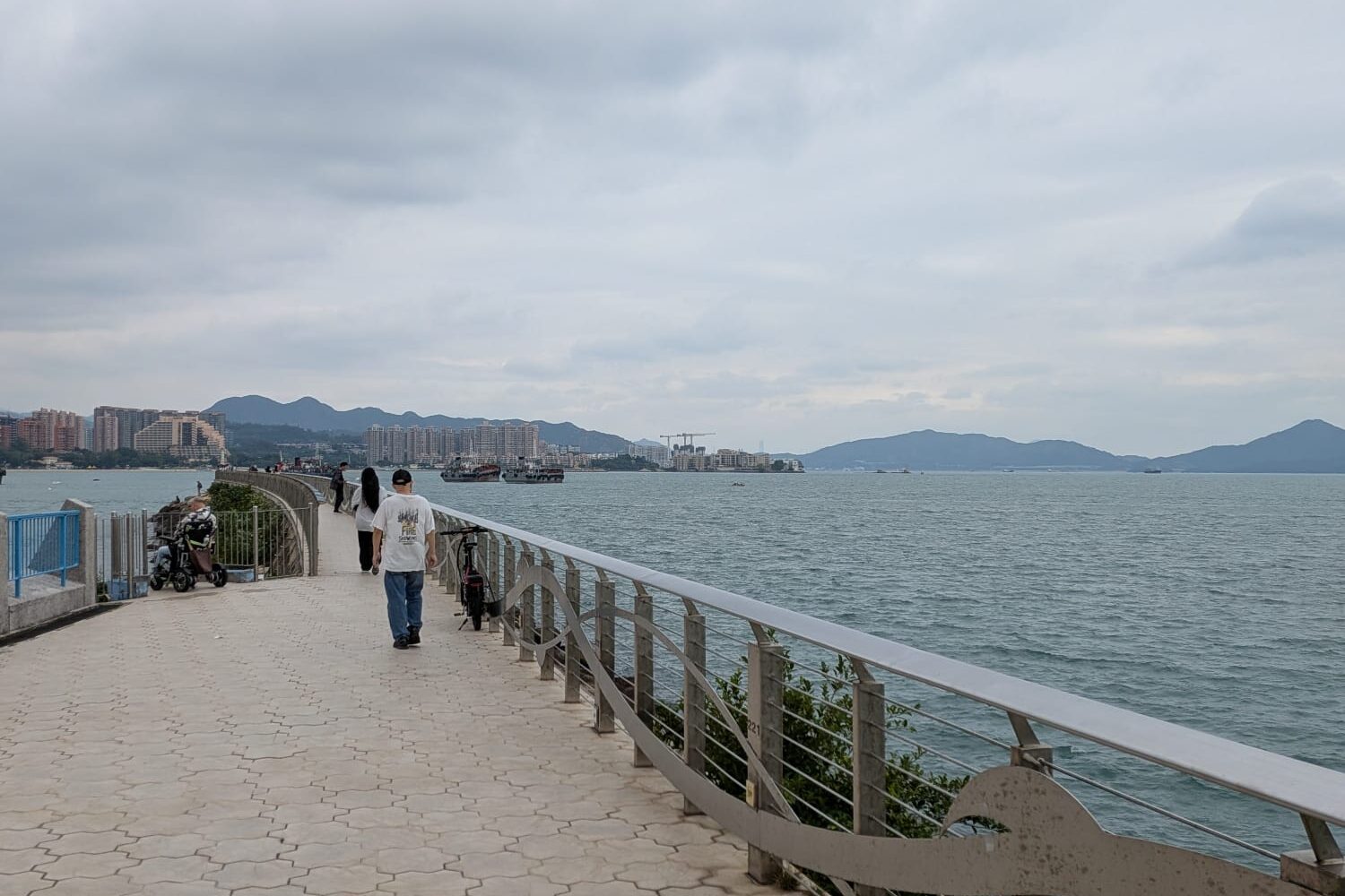 I started on the Tuen Mun Promenade, where the autumn breeze comes in steady bands. Almost too windy, but in the best way. The air feels rinsed. Across the water, Gold Coast sits like a sun-bleached postcard, and beyond it the airport is a faint silhouette, planes sliding in and out like punctuation against the sky. The scale here is different: horizon, harbor, sky, everything given room to breathe.