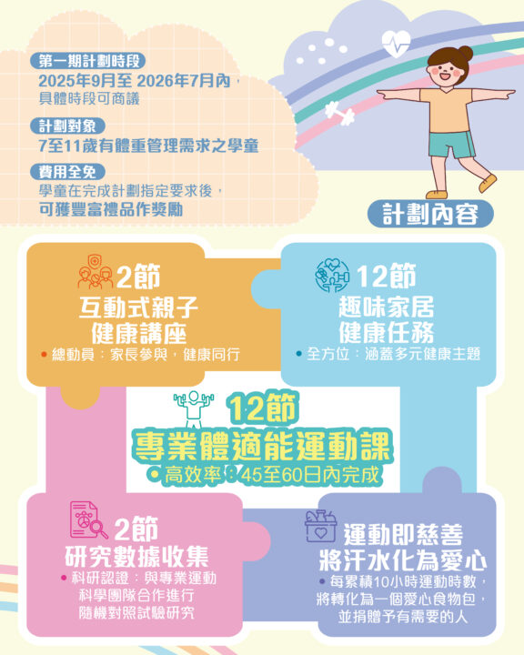 Pound for Pound, funded by A-Zone Foundation and organised by InspiringHK Sports Foundation, is a children’s fitness and health management programme designed to support children with weight management needs. The programme consists of children’s fitness classes, take-home health tasks, and parent-child health seminars, aiming to increase physical activity levels and foster healthy habits among children, addressing the weight and health challenges caused by physical inactivity and low health awareness.