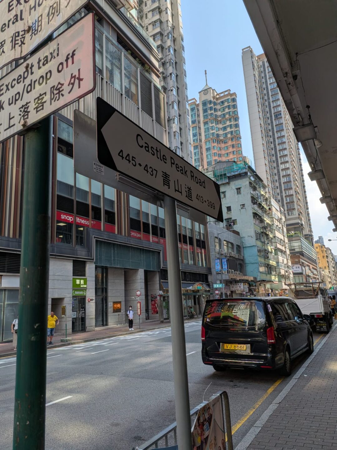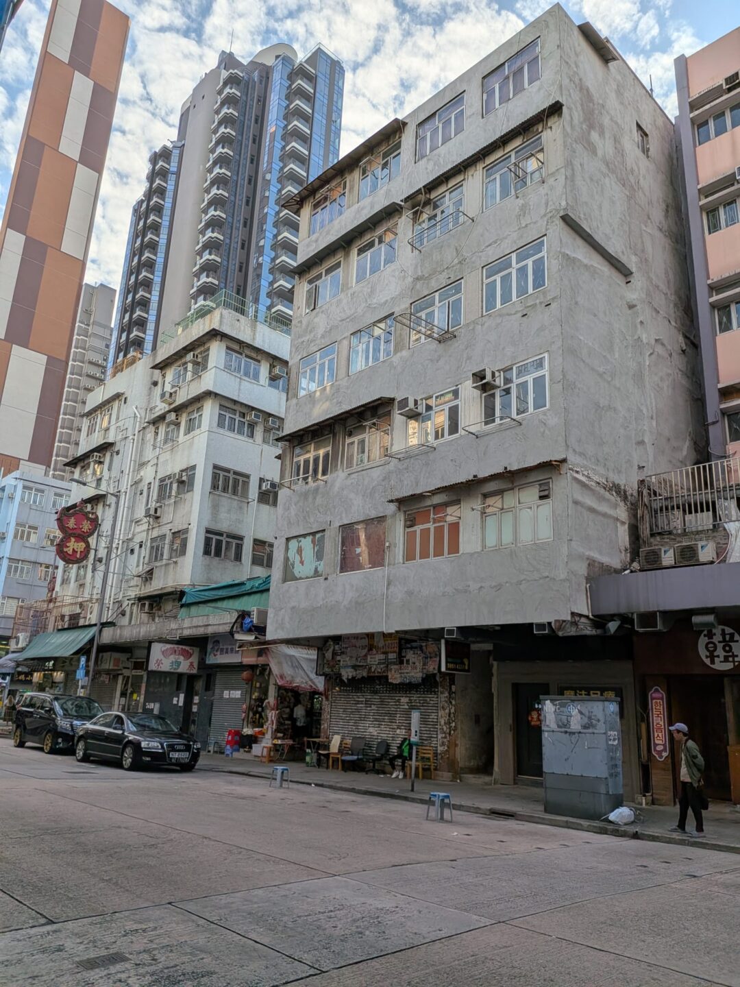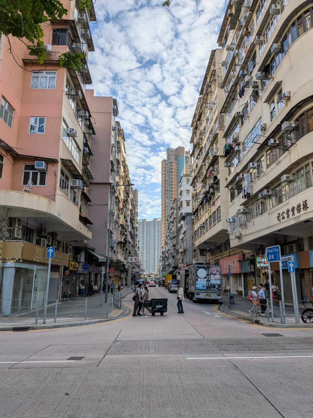 I took Castle Peak Road, that busy industrial spine where the old meets the new. Low‑rise walk‑ups shoulder next to fresh single‑tower inserts; scaffold and signage knit the gaps. Gentrification moves here step by step, but it hasn’t stripped the charm. The textures hold. Metal shutters wear hand‑painted numbers, tailors post tape‑measure hours, and above it all, new glass tries to learn the light.