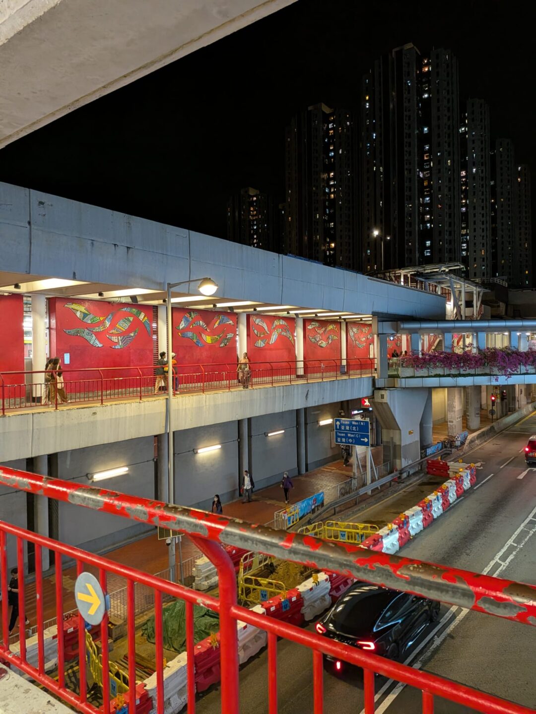 I walked from Castle Peak Road in Tsuen Wan and cut to Lai Shun Road, slid past the Tsuen Wan West Sports Centre, crossed into Ho Shing Garden. The legs of the elevated road loomed over benches where people talked and dozed; beneath them, graffiti that feels uniquely Tsuen Wan, easy to miss unless you’re on foot.