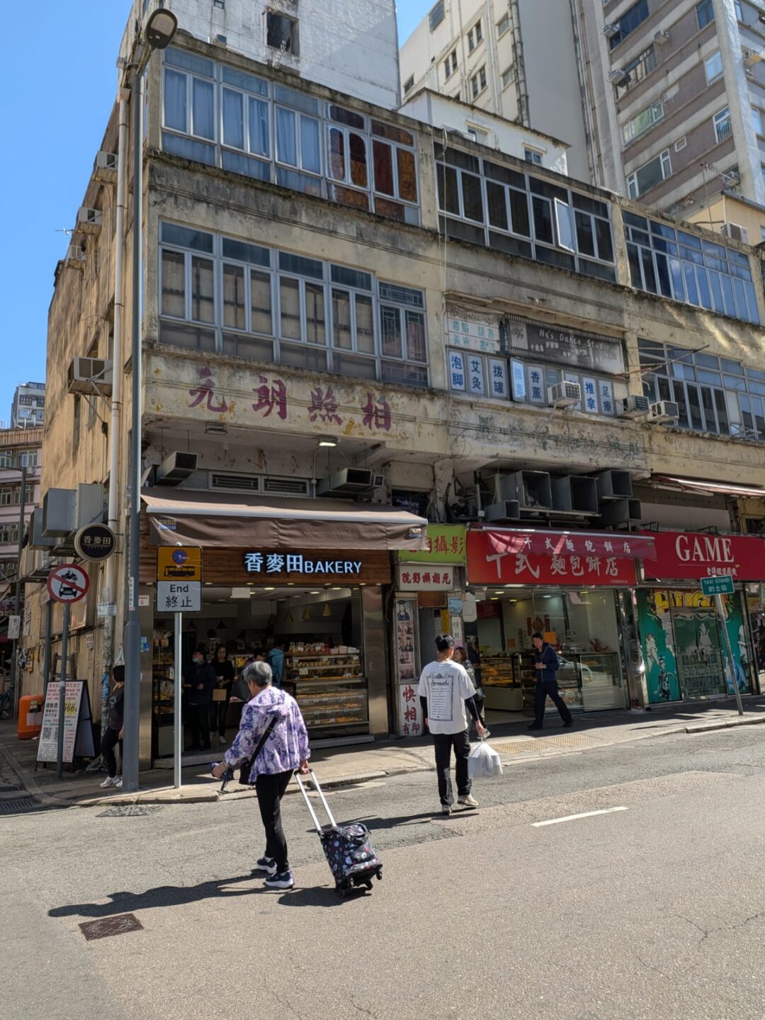 On the pavements the air feels wider. There are Girl Scouts selling charity flags, so it must be Saturday. There are fewer chain façades, fewer For Lease signs; shops look used rather than curated. You learn quickly that charm doesn’t require sameness. An old photo studio has held its corner through format changes and phone cameras. Malls with names like Happy Plaza don’t need hyperbole inside to be Yuen Long; the name is enough. Wing Wah’s wife cakes complete the town’s centre of gravity.